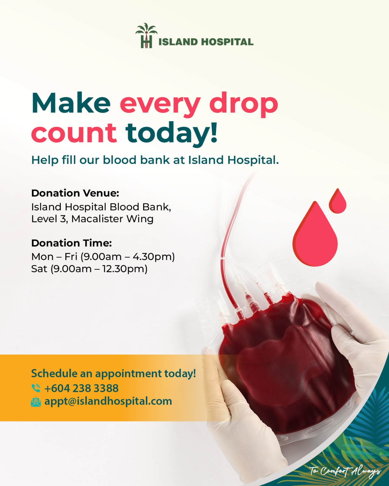 Every blood donation can save up to three lives; therefore, Island Hospital urgently needs blood donations to support our patients in need. Your contribution can make a significant difference and save lives.