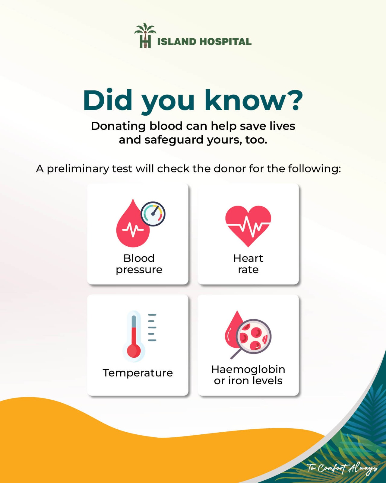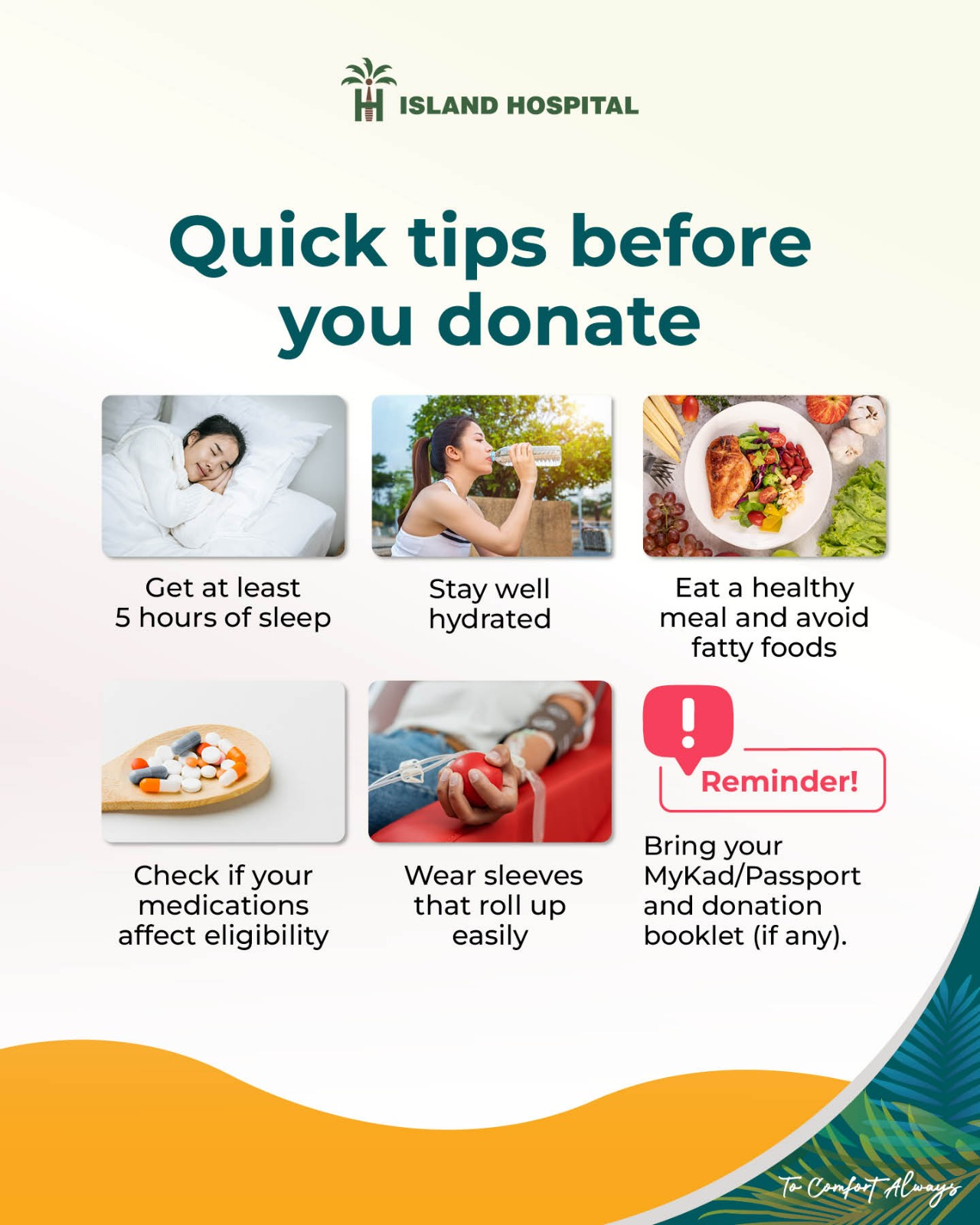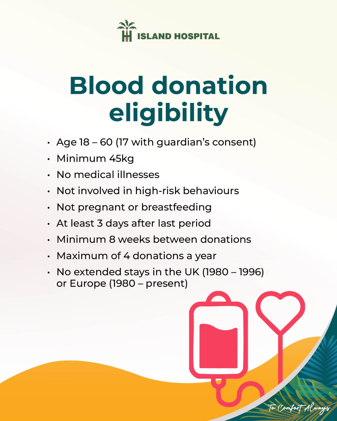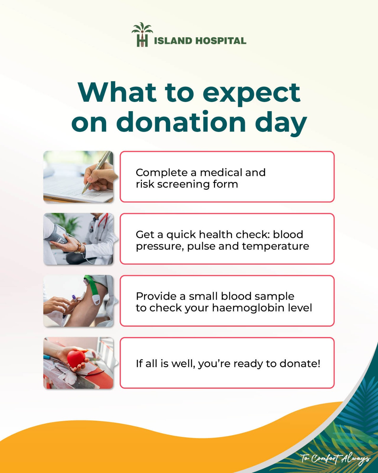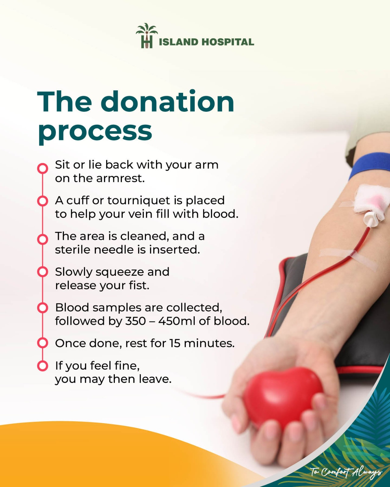 At Island Hospital, we prioritise your comfort and safety. Our state-of-the-art facilities and dedicated healthcare professionals ensure a seamless and positive donation experience. Your health and well-being are our top priorities.