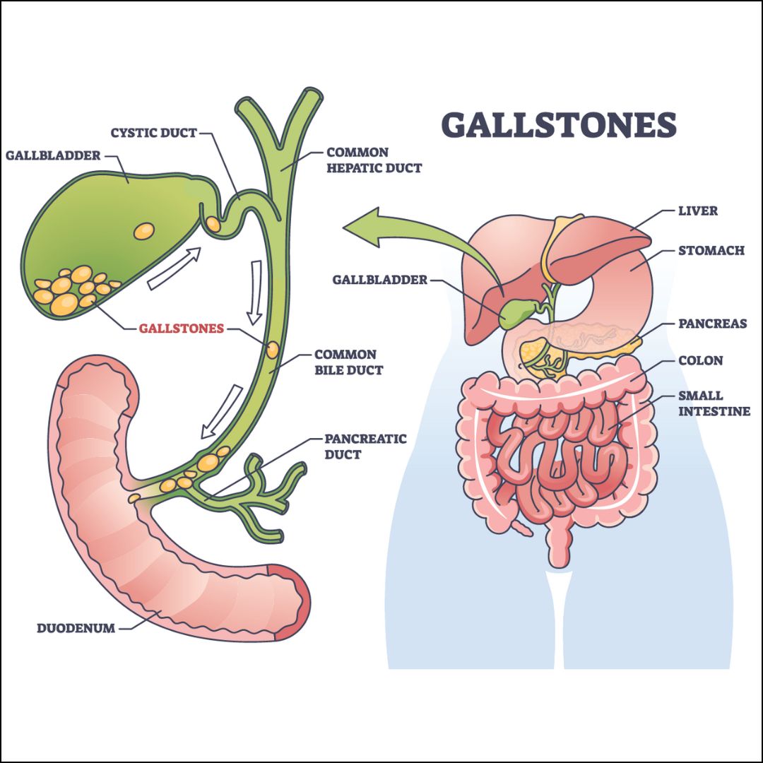 Gallstones are solid, pebble-like particles that form in the gallbladder — a small, pear-shaped organ located on the right side of your abdomen, just beneath your liver. The gallbladder’s main role is to store and release bile, a digestive fluid made by the liver that helps break down fats after meals.